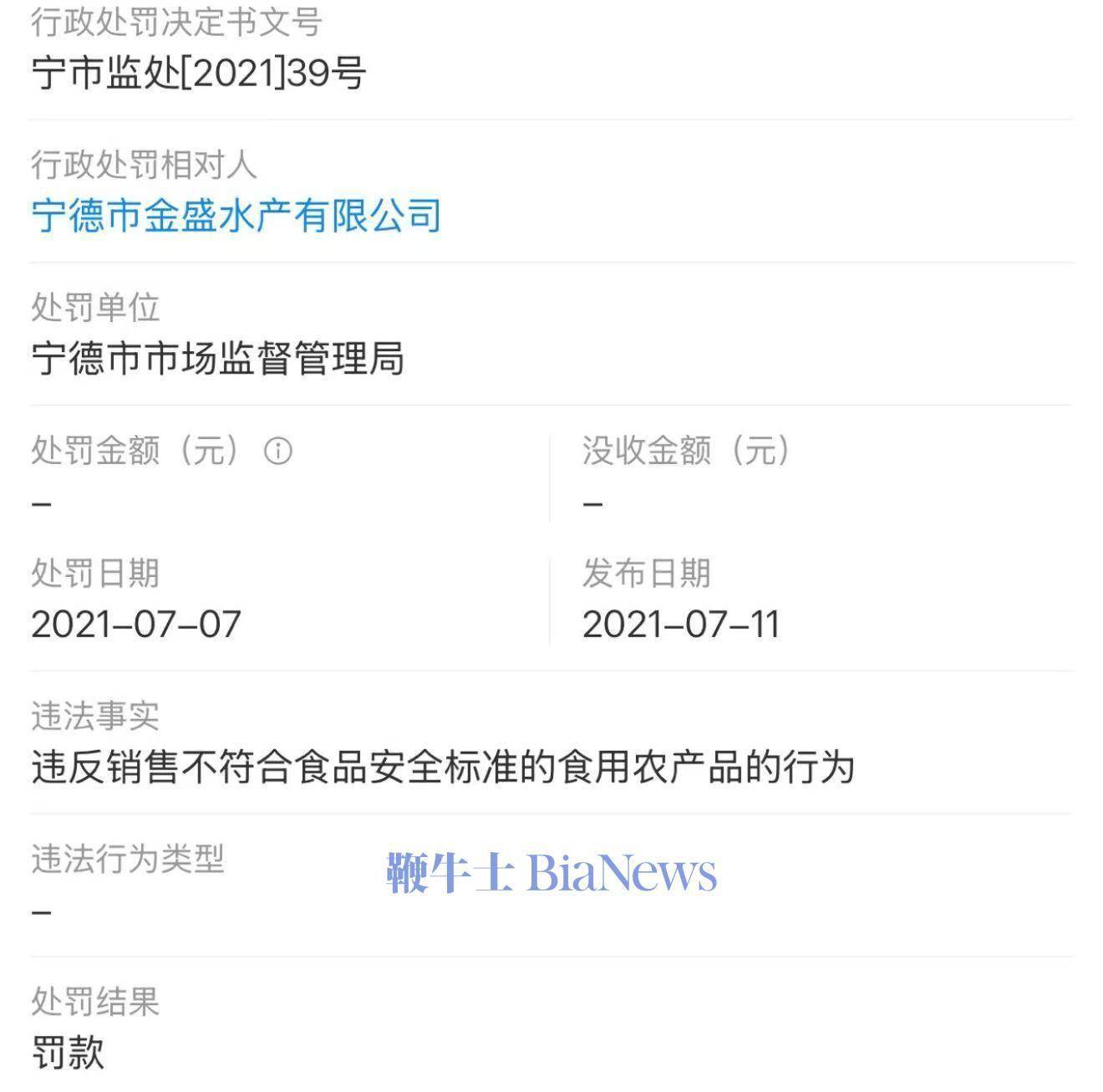 惩罚决定书还称,当事人宁德市金盛水产无限公司发卖黄花鱼产物履行了进货检验权利,有充实证明其不晓得所采购的食用农产物不合适食物平安尺度,并能照实申明其进货来历。按照相关,经研究决定:对当事人予免得于惩罚。